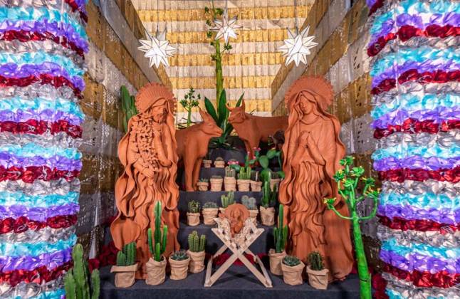 El centro de la exposición es un belén creado por el maestro Alfonso Soteno Fernández, integrado por diez figuras de barro rojo modelado a mano que superan los 170 centímetros de altura. Las piezas representan la escena tradicional del nacimiento de Cristo, con la Sagrada Familia, los tres Reyes Magos y los animales que acompañan la estampa. Cada figura es resultado de un proceso artesanal minucioso que se inicia con la preparación del barro —mezclado, secado, molido y suavizado con plumilla— y continúa con un modelado completamente manual, pues según Casa de México, esta es una práctica distintiva de los Soteno, quienes hacen muy poco uso del alambre para crear estructuras.