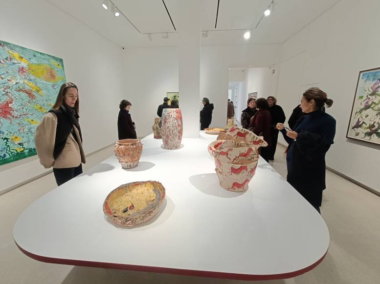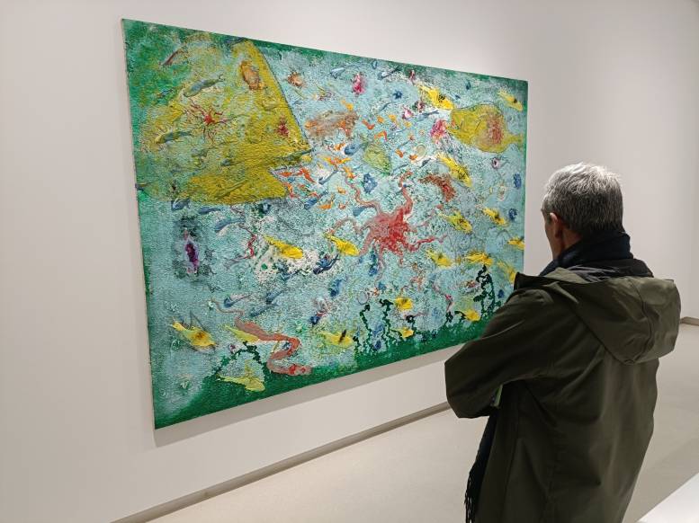 La tercera y última sala la conforma un centro de cerámicas que entremezcla elementos taurinos, marítimos y vegetación figurativa. En uno de los cuadros, ‘Vanitas sur mer’, dos floreros presiden el plano irradiando luz y color, tras un fondo de aguas bravas y un cielo oscuro que acecha la escena. Otro lienzo, denominado ‘Pop Central’ y que se ubica en un lateral de la sal, es un alarde de color y formas (estrellas marinas, tentáculos, pececillos amarillos que parecen querer salir del cuadro por una de las esquinas), como ostentación de vida y creatividad en el entorno subacuático.