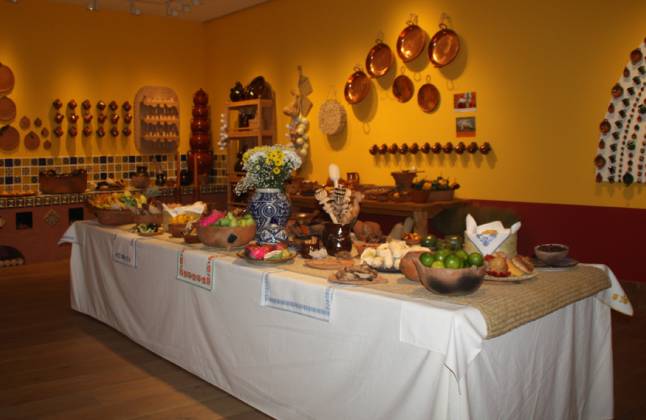 Más de 2.400 piezas originales traídas de México, y elaboradas por 24 maestros artesanos –utilizando técnicas tradicionales–, conforman la muestra. Hay una convivencia de elementos españoles como el fogón de leña, los azulejos de Talavera o las paellas de cobre; con ingredientes indígenas como mazorcas, frijoles, chiles, cacao o piloncillo.