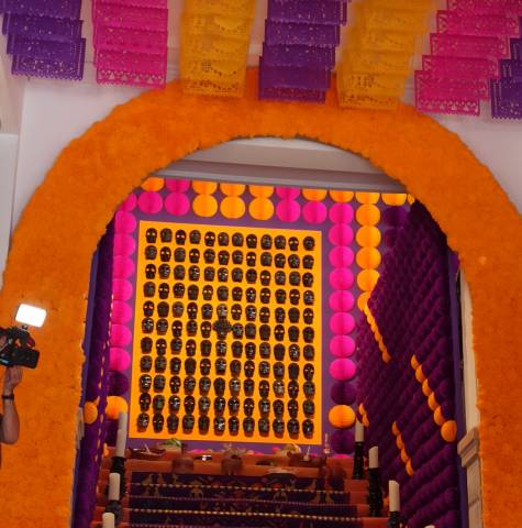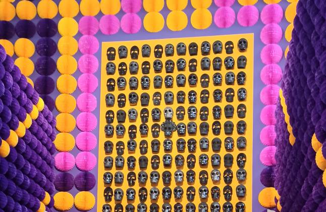 También, un tapete de Huamantla, que ha sido elaborado in situ por artistas oaxaqueños y está hecho de aserrín de colores, formando “un camino que da la bienvenida a los difuntos y los conduce hacia la ofrenda realizada por los artistas Angélica Vértiz y Rubén Pérez”. Y, por último, una hilera de cráneos, conocida con el nombre de 'tzompantli', con los que los mexicas rendían culto al dios del sol y la guerra, y que se podrá contemplar en el muro principal. Está formada por más de 130 calaveras fabricadas en barro negro y realizadas artesanalmente en el pueblo de San Bartolo Coyotepec, ubicado en el estado de Oaxaca.
