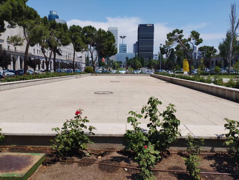 Los Jardines de los Nuevos Ministerios, en el paseo de la Castellana, constan de un gran espacio diáfano con plazas, fuentes y estanques, alrededor del cual se disponen los diferentes ministerios; también albergan la sala de exposiciones “La Arquería” y un pequeño museo de piezas industriales al aire libre. Fueron concebidos por Ricardo Ortiz, jardinero mayor del Ayuntamiento de Madrid, y actualmente, tanto los dos grandes estanques rectangulares como la fuente circular, carecen de agua.