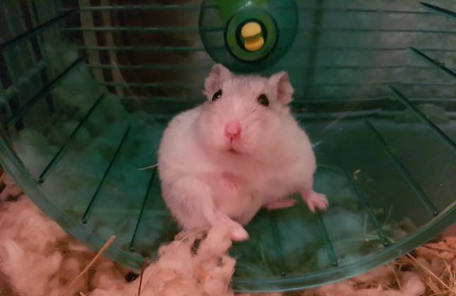 Croqueta es un hamster ruso, nacido y criado en Chamberí desde hace 11 meses. Es comilón y muy activo por la noche. Disfruta con las pipas y el calabacín, también haciendo nidos de algodón natural y corriendo en su rueda. Si lo coges, se deja rascar y acariciar y come en las manos. Reconoce algunas voces caseras y acude a su llamada. También nos observa sentado desde su igloo.