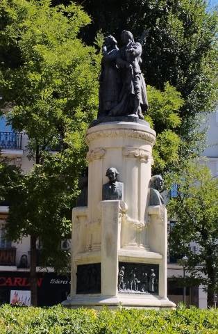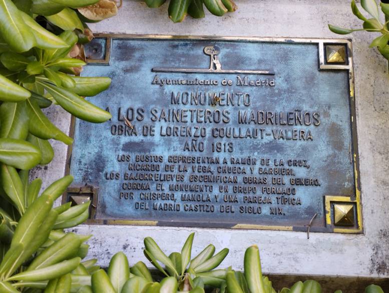 Adosados al pedestal se encuentran los bustos de Ramón de la Cruz y Ricardo de la Vega representando el sainete, y de Federico Chueca y Francisco Asenjo Barbieri, en representación de los que llevaron a escena las costumbres típicas del pueblo de Madrid que se escribieron en zarzuelas.