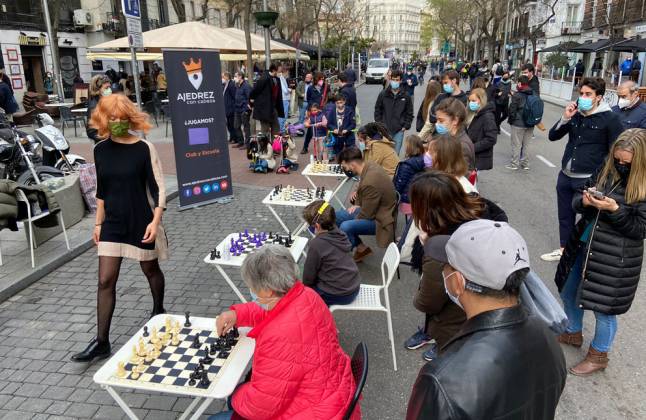 La mañana del domingo 7 de marzo, con motivo de la celebración del Día Internacional de la Mujer, la escuela Ajedrez con Cabeza (Cercedilla, 3) tendió una original emboscada a vecinos y curiosos del distrito en la actividad que organizaron aprovechando la peatonalización de la calle de Fuencarral: la maestra internacional de ajedrez María Rodrigo Yanguas se disfrazó de Beth Harmon, la protagonista de la exitosa serie ‘Gambito de dama’, y estuvo jugando cerca de tres horas en cinco tableros simultáneos contra decenas de transeúntes que iban rotando según iban perdiendo contra la ajedrecista, haciendo las delicias de cuantos curiosos se acercaban a comprobar el desarrollo de las partidas.