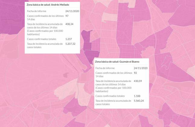 El distrito también encabeza los listados de contagios por zonas básicas de salud, con Guzmán el Bueno y Andrés Mellado como áreas con mayor incidencia, si bien aquí cabe diferenciar la tendencia ascendente en el caso de Andrés Mellado, que pasa de 357,82 a 408,34 positivos –superando el límite para el confinamiento, que anunció el pasado viernes el viceconsejero de Salud Pública–, de la obtenida por Guzmán el Bueno, que mantuvo su discreto descenso en los últimos 7 días, al pasar de 439,95 a 430,59.