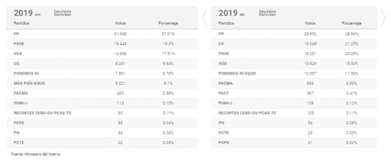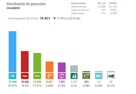 Por su parte, Unidas Podemos también retrocede respecto a la anterior convocatoria electoral, y pasa de los 10.357 votos del 28A a los 7.501 registrados esta vez, un 8,76%.