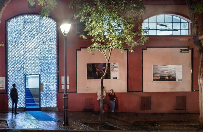 Durante este primer fin de semana de octubre, y hasta el próximo lunes 4, el Mercado de Vallehermoso acogerá la decoración insólita y efímera de su puerta principal, adornada con más de 3.500 botellas de agua que se iluminarán por la noche.
