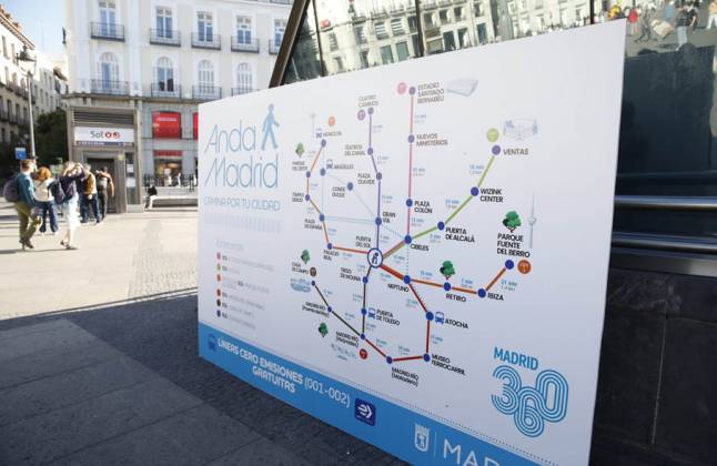 El mapa ‘Anda Madrid’ incluye la distancia existente entre las distintas etapas de cada ruta, las localizaciones y el tiempo medio que se tarda de un punto a otro caminando, así como los trazados de las Líneas Cero de la EMT, gratuitas, para que el usuario pueda enlazar sus trayectos con estos autobuses.
