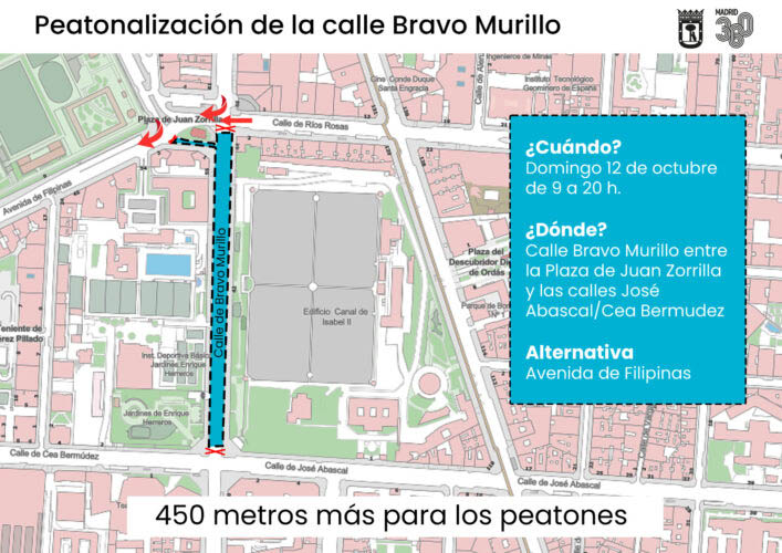 El Ayuntamiento de Madrid va a llevar a cabo una prueba piloto de peatonalización de un tramo chamberilero de la calle Bravo Murillo este domingo 12 de octubre, con motivo del Día de la Fiesta Nacional. En concreto, serán 450 metros peatonalizados de esta vía, entre la plaza de Juan Zorrilla y las calles José Abascal/Cea Bermúdez. Este tramo permanecerá cortado al tráfico entre las 9:00 y las 20:00 horas.