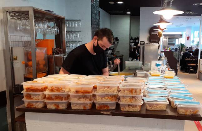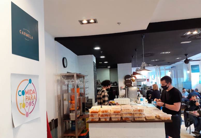 La mañana va tocando a su fin. Sobre la barra del bar apenas quedan bolsas con el menú y las que quedan son para algunos sin techo de la zona, para gente que ha de alimentar a sus hijos… “Sé quién se va a comer lo que preparamos cada día, personas muy vulnerables, que verdaderamente lo necesitan y que podríamos ser cualquiera de nosotros”, subraya Jaime Rincón, quien aclara que “no contamos con ningún tipo de ayuda pública, todo sale de manos privadas, de particulares, de empresas que donan comida”. Una comida cocinada con el cariño como principal condimento, porque son “alimentos saludables, frescos y variados, porque estamos hablando de solidaridad, pero también de dignidad”.