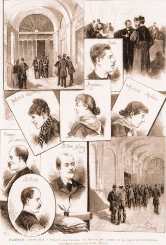 El juicio comenzaría el 26 de marzo de 1889, ocho meses después del crimen. La expectación es tal que la cola para asistir a la vista rodea el Palacio de Justicia. El abogado de la defensa es nada menos que Nicolás Salmerón, expresidente de la República. En su primera declaración, Higinia había acusado del asesinato a José Vázquez, el pollo Varela, hijo de la viuda y personaje de vida desordenada y golfa, que el día de autos cumplía condena en la Cárcel Modelo por el robo de una capa. La criada asegura que Varela la coaccionó y sobornó para que acudiera a por el petróleo, quemara el cuerpo y limpiara la sangre. Pero la acusación sobre el hijo de la víctima tiene unas implicaciones más graves y que salpican al director de la cárcel, José Millán Astray –padre del fundador de la Legión–, quien, al parecer, permitía a Varela entrar y salir del penal a su antojo. También se establece una conexión entre Astray e Higinia, al que conocía a través de un tercero, el cojo Mayoral, exnovio de la acusada y que regentaba una cantina frente a la Modelo. Azuzada por la cobertura mediática, el crimen estimula el morbo de la sociedad madrileña, que se divide en higinistas y varelistas, y discuten en tertulias y comercios.