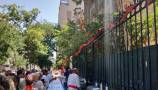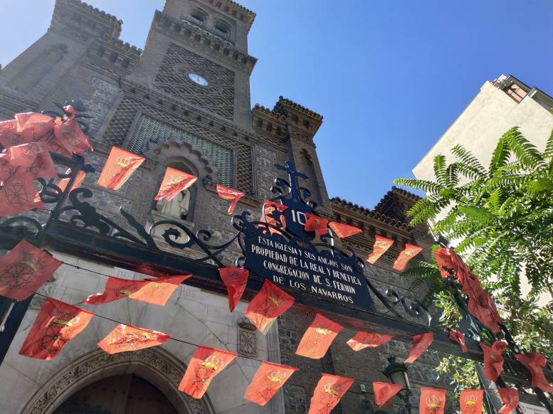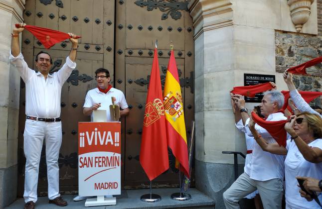 Los colores blanco y rojo también han teñido las calles de Chamberí este 6 de julio. "San Fermín, San Fermín, San Fermín" gritan centenares de personas que se agolpan a las puertas de la iglesia San Fermín de los Navarros para ver el chupinazo. Como cada año desde 1974, en el mismo momento en que se dispara el cohete en Pamplona, otro igual estalla en el cielo de Madrid.