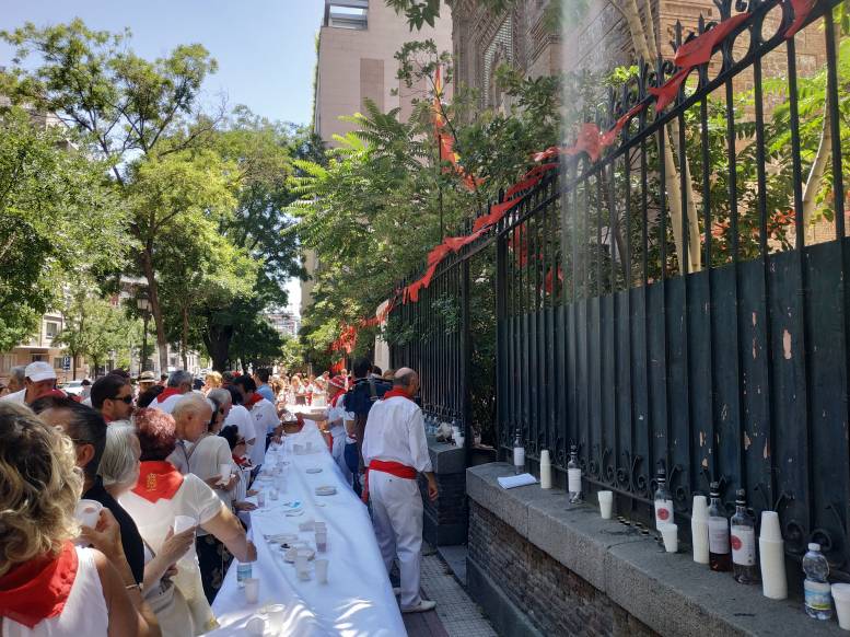 Después del lanzamiento del cohete que ha transcurrido sin incidentes, la fiesta ha comenzado con música y un aperitivo ofrecido por la Comisión de Festejos. Su coordinador explica que han instalado tres bares, dos dentro del patio y uno en la acera, junto a la puerta de la iglesia, para “invitar a todo el que quiera venir a celebrar San Fermín”. Para la conmemoración de este año, a la que calculan que han acudido unas mil personas, han ofrecido vino y 120 kilos de chistorra.