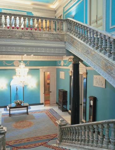 Así, se actualiza el pórtico de acceso, ahora una entrada monumental con capiteles de estilo clásico; también se transforma el vestíbulo, donde se instala una espectacular escalera de doble ramal, flanqueada por dos columnas de granito negro, que obliga a quitar varias estancias de arriba; por último, se eleva el techo del salón principal, destinado a bailes y ceremonias de recepción, lo que aboca a una reforma de la cota del primer piso, con lo que ha de añadirse un nuevo tramo de escaleras para acceder a algunas habitaciones.